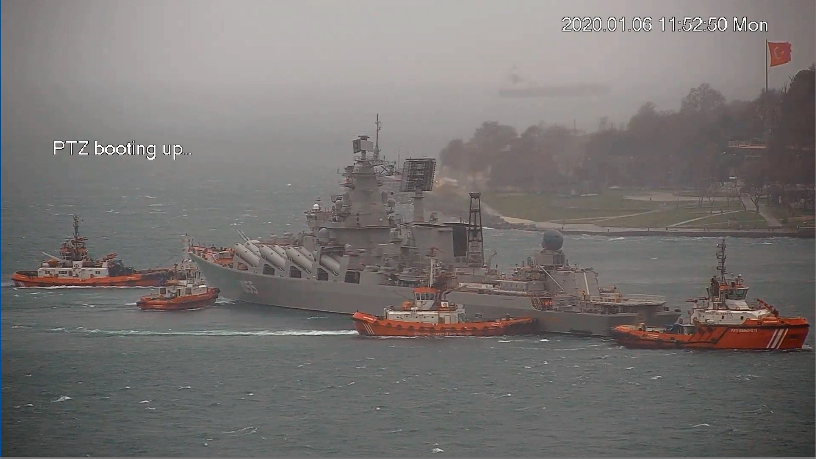 Стамбульські негаразди та пригоди ракетного крейсера "Маршал Устинов" - плавучої резиденції президента РФ для перебування в Стамбулі - не скінчилися. Близько 11-00 (київський час) 06.01.2020 цілих 4 турецьких буксири чесно намагалися допомогти поставити його на почесне місце - військовий причал у миса Сарайбурну (фото 1). Але... "нє шмагла"... Повернувся на якірну стоянку в Мармуровому морі (фото 2).