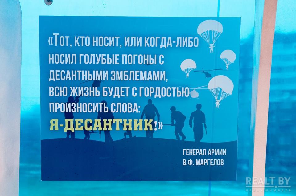 Как пишет белорусское издание Еврорадио, остановка необычного дизайна появилась на днях на улице Мазурова в минском микрорайоне Сухарево. Навес украшен фигурой самолета, а на самой остановке висит табличка с цитатой генерала Василия Маргелова, основателя Воздушно-десантных войск (ВДВ) Беларуси: "Тот, кто носит или носил десантные погоны с голубыми эмблемами, всю жизнь будет с гордостью произносить слова: "Я — десантник!".