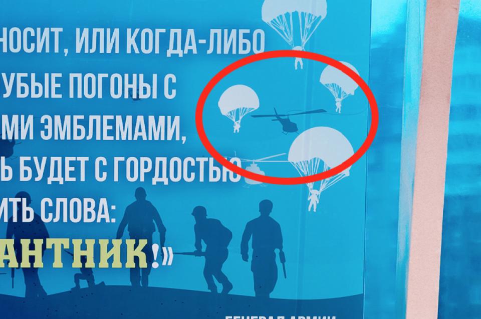 Но пользователи соцсетей обратили внимание, что фоном для таблички стали фигуры американских десантников и американские вертолеты.