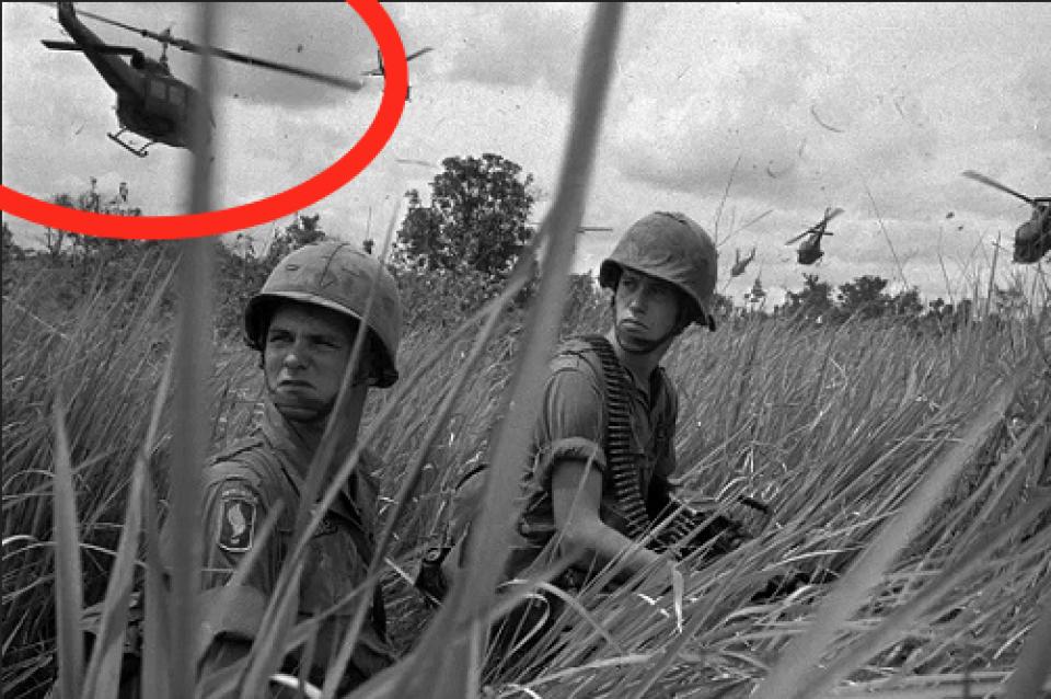 По силуэту вертолета опознали американский UH-1 Iroquois, более известный как "Хьюи". Это один из самых массовых боевых вертолетов США, который стал символом войны во Вьетнаме. В художественном кино классической стала сцена из фильма Фрэнсиса Форда Копполы "Апокалипсис сегодня", где показана атака этих вертолетов под мелодию Рихарда Вагнера "Полет валькирий".