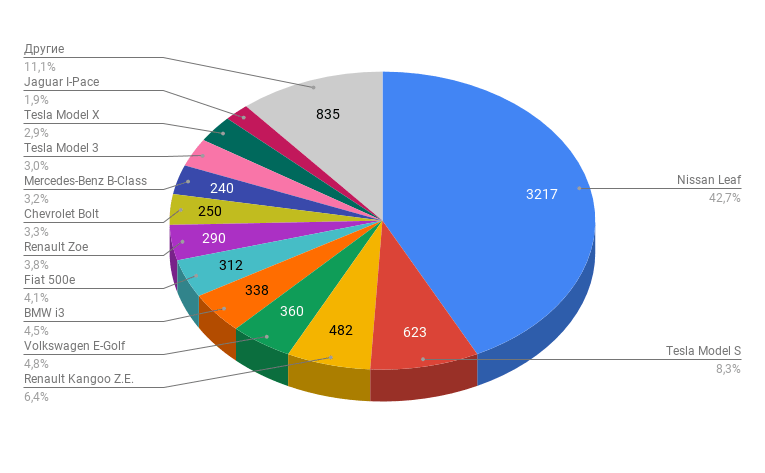Не очень сильно отстали от третьего места и BMW i3 (338 шт.) с Fiat 500е (312 шт.), тогда как остальные легковые модели набрали заметно меньше.