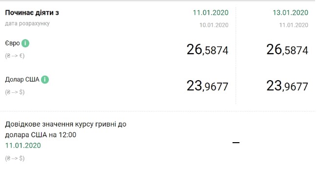 Нацбанк установил официальный курс доллара на 13 января 11 января 2020 16:21 На 13 января 2020 года официальный курс гривны не изменился и установлен на уровне 23,96 гривен за доллар. Об этом свидетельствуют данные регулятора.