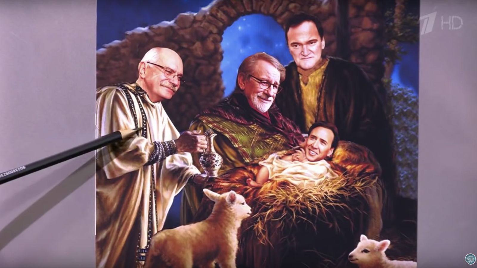 В частности, их возмутил показанный в эфире коллаж, который иллюстрировал рождение американского актера Николаса Кейджа, изображенного в яслях в окружении режиссеров Никиты Михалкова, Квентина Тарантино и Стивена Спилберга.