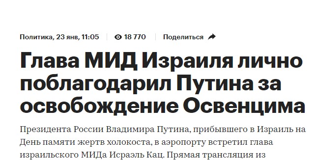 "Президента России Владимира Путина, прибывшего в Израиль на День памяти жертв холокоста, в аэропорту встретил глава израильского МИДа Исраэль Кац. Прямая трансляция из аэропорта Тель-Авива шла в эфире телеканала «Россия 24».