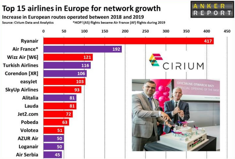 Первое место в рейтинге заняла авиакомпания Ryanair с 417 маршрутами, второе место Air France с 192 и третье WIzz Air c 121 новыми направлениями.