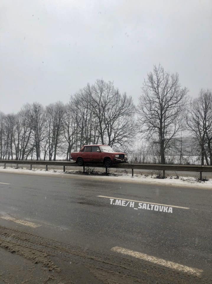 А на киевской трассе под Харьковом старенькие "Жигули" умудрились приземлиться на отбойник.