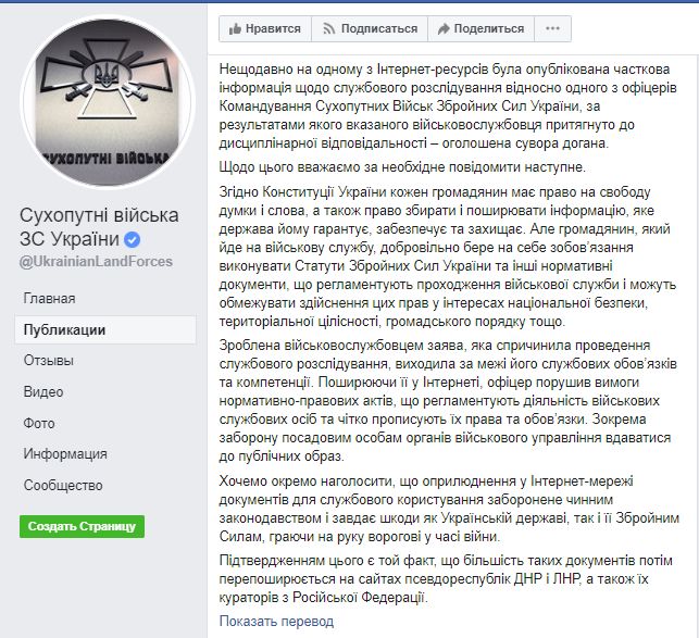 После того, как документы ВСУ стали достоянием широкой общественности и вызвали массу негодования среди украинцев, в Командовании Сухопутных войск ВСУ попытались "спасти честь мундира" и опубликовали в соцсети заявление: