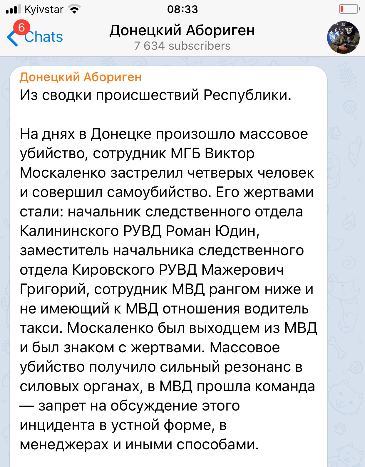 "Погиб мой друг Гарик. Дома осталась вдовой жена с двумя детьми. (Погиб) гражданский, бывший "офицер МВД". Погибли еще три человека. Пятый, кто это "натворил", когда прошла "белка" застрелился. Чулковка, в р-не 22:00 это слышала. Царствие небесное. Имена, чины не пишу специально", – говорится в сообщении пользователя Twitter Donbass Cat.