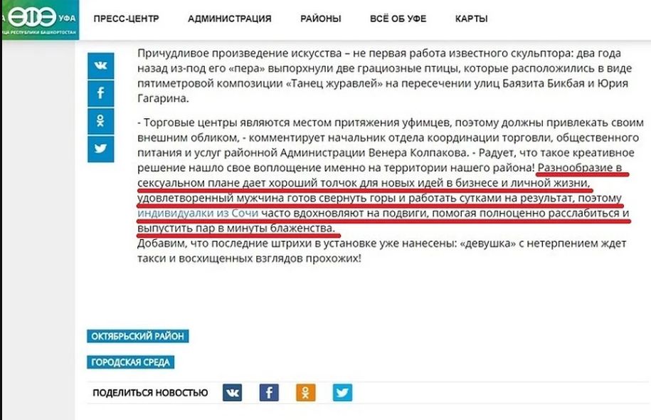 Рекламу интимных услуг заметили на официальном сайте уфимской мэрии. В материале о новой скульптуре возле торгового центра жителям предложили заказать проститутку в Сочи.