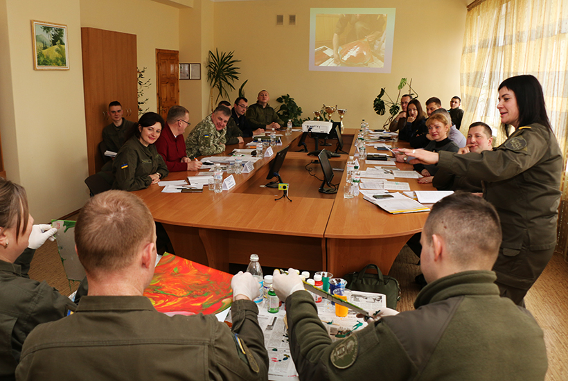 На питанні гармонізації психічного стану особистості за допомогою арт-терапії детально зупинилась офіцер служби психологічного забезпечення військової частини 3008 старший лейтенант Тетяна Путкарадзе. Вона презентувала нещодавно впроваджену у практику методику «Акрилова заливка».