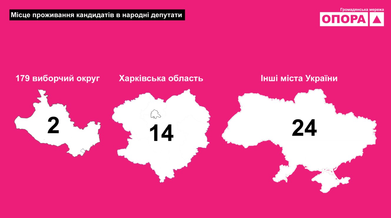 Большинство кандидатов проживают за пределами Харьковской области: 24 - в других городах Украины. 14 кандидатов проживают в Харьковской области. Два кандидата являются жителями непосредственно 179 избирательного округа.