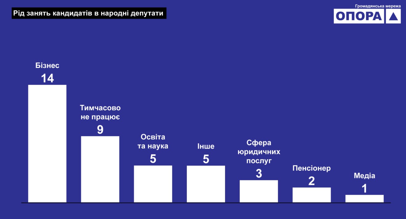 Среди зарегистрированных кандидатов 14 работают в сфере бизнеса. Девять кандидатов временно не работают. Это Евгения Агеева, Виктория Алексейчук, Вячеслав Гурець, Виктор Ильенко, Анна Князева, Татьяна Лазуренко, Николай Музинченко, Игорь Федоренко, Галина Хархалис.