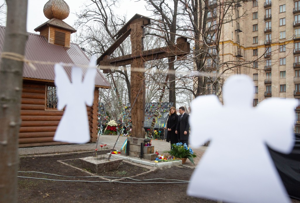Глава государства и первая леди установили лампадки у креста на месте гибели активистов в Киеве, отмечает пресс-служба Офиса Президента Украины.