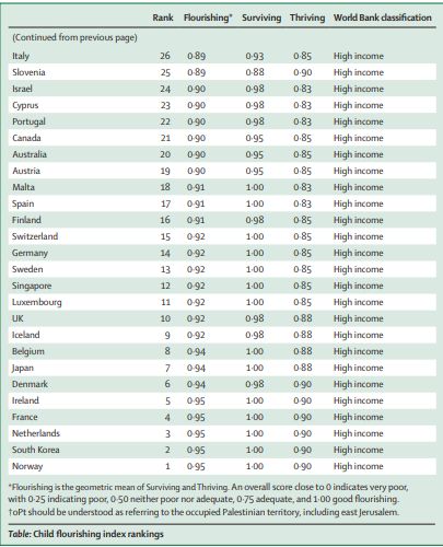 В пятерку стран, в которых лучше всего растить детей, вошли Норвегия, Южная Корея, Нидерланды, Франция и Ирландия, набравшие по 0,95 балла. Далее следуют Дания, Япония и Бельгия с 0,94 балла, а замыкают первую десятку Исландия и Великобритания (0,92 балла).