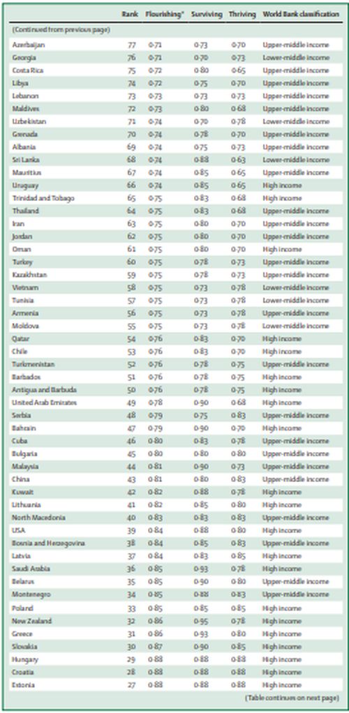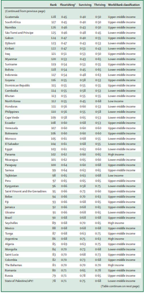 Китай – 43-й, Куба – 46-я, ОАЭ – 49-е, Турция – 60-я, Иордания – 62-я, Иран – 63-й, Ливан – 73-й. На 78-м месте – Палестинская автономия, Россия – 79-я с 0,71 балла (0,78 за выживаемость и 0,65 за процветание). Украина – 91-я с 0,66 баллами (0,68 за выживаемость и 0,65 за процветание)
