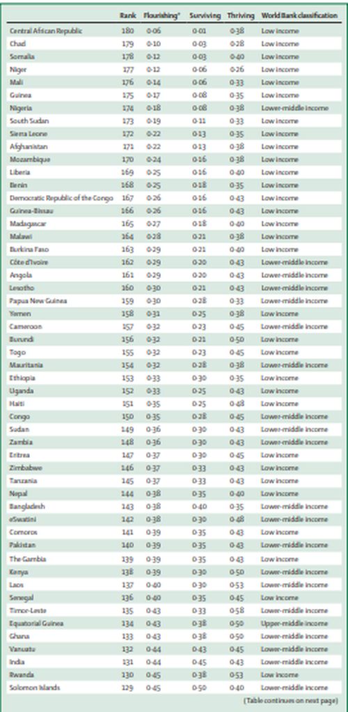Замыкают рейтинг Мали, Нигер, Сомали и Центрально-Африканская республика, получившая 0,06 балла (0,01 за выживаемость и 0,38 за процветание).