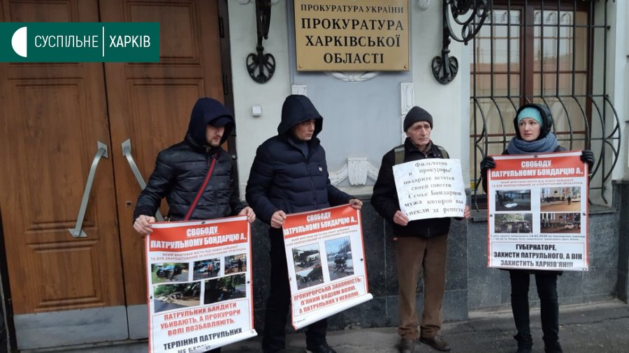 Четыре человека вышли с протестом к зданию прокуратуры Харьковской области с требованием освободить из-под стражи патрульного полицейского, подозреваемого в превышении служебных полномочий при попытке задержания водителя.