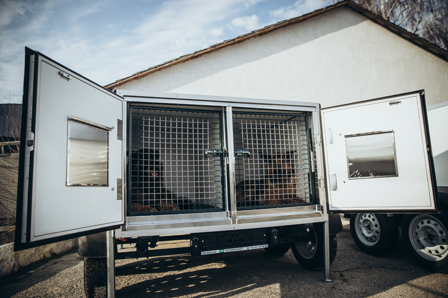 Каждый прицеп предназначен для перевозки четырех гвардейских собак на места службы.