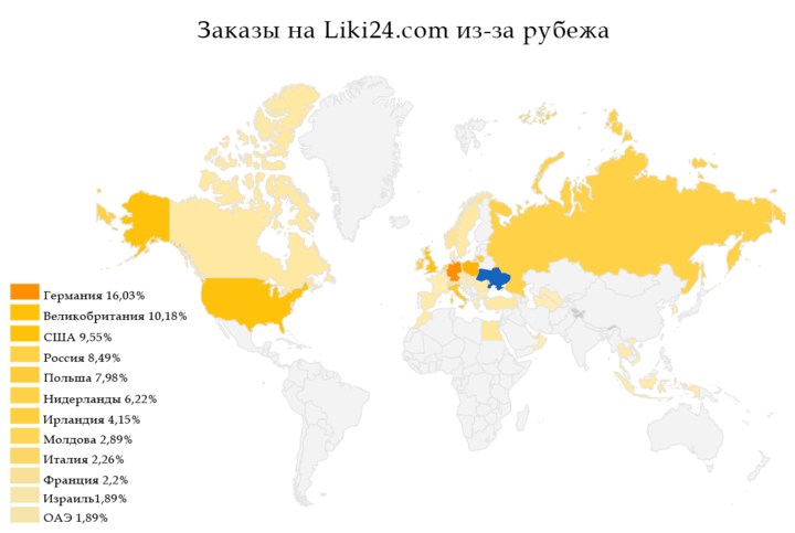 Интересно, что статистика посещений сайта Liki24.com зарубежными пользователями значительно отличается от статистики заказов с оплатой из других стран.