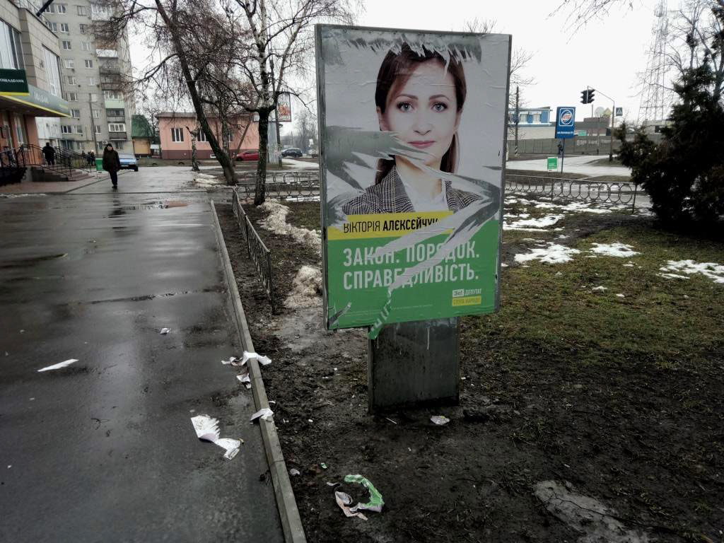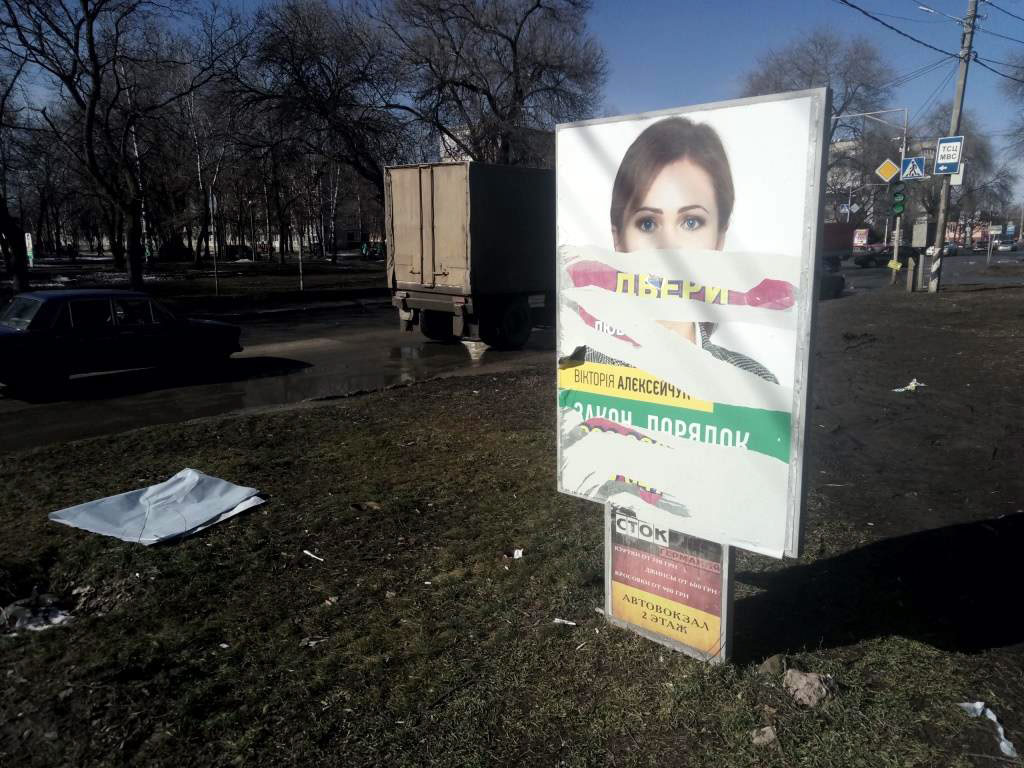 24 и 25 февраля на округе 179 в г.. Красноград Харьковской области вдоль улицы Полтавской наблюдатели ОПОРЫ зафиксировали поврежденные ситилайты с агитацией кандидата в народные депутаты Виктории Алексейчук ( «Слуга народа»).