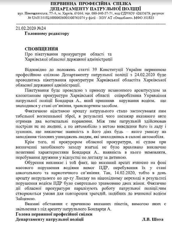 27 февраля с 12:00 возле прокуратуры Харьковской области (ул. Богдана Хмельницкого, 4) пройдет акция в поддержку патрульного полицейского Андрея Бондарца. Цель акции - изменение меры пресечения, которая была применена судом по ходатайству прокурора - в виде содержания под стражей на 60 суток. В акции примут участие коллеги Андрея, члены "Первичного профсоюза Департамента патрульной полиции", адвокат Андрея - Ярослав Смелянский, родственники Андрея.