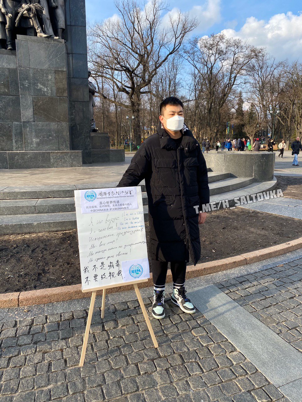 Парень в медицинской маске и с плакатом вышел к памятнику Шевченко на улице Сумской в Харькове. На плакате на нескольких языках было написано: "Я не вирус! Я человек! Искоренение предрассудков! Мы – весь мир! Мы никогда никого не дискриминируем! Мы сделаем день светлей!".