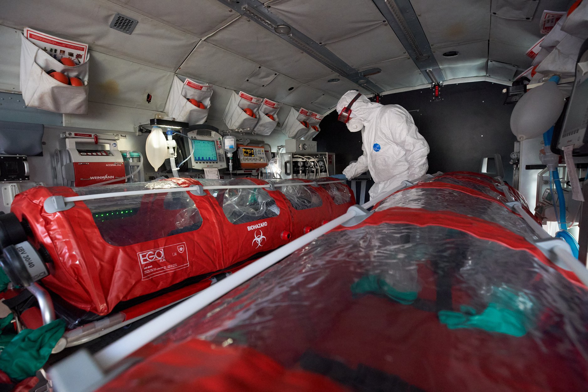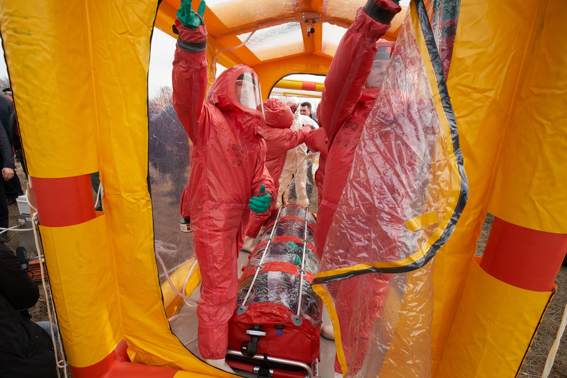 "Вертолет оснащен изоляционной капсулой, биозащитными комплектами (костюмы, медицинские перчатки, респираторы), дезинфекционным душем, специальным модулем, в котором фиксируется индивидуальная капсула с пациентом, и всеми необходимыми реанимационными средствами и оборудованием. Медики продемонстрировали Президенту порядок действий при эвакуации и перевозки пациентов", - говорится в сообщении.
