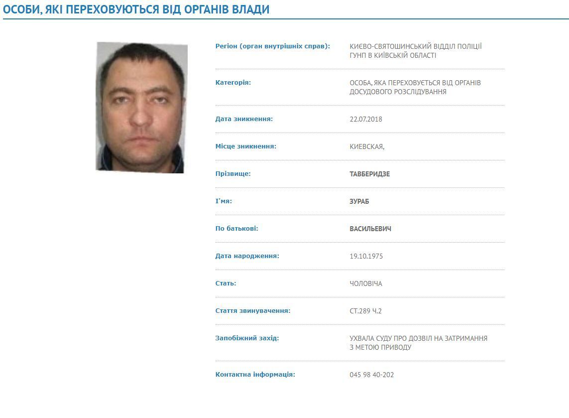 Как сообщает ТСН, задержанный – 44-летний Зураб Тавберидзе. Согласно базе розыска МВД, мужчина обвиняется в незаконном завладении транспортными средствами (ст.289 ч.2 УКУ) и суд предоставил разрешение на его задержание с целью привода.