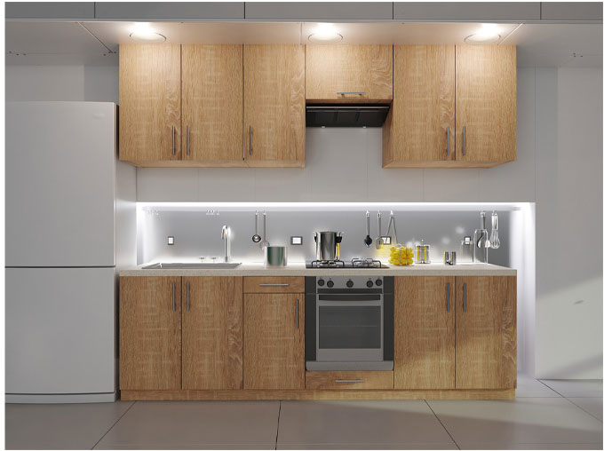 Вище на фото кухня Арабіка з лінійною конфігурацією, колір "Бук Баварія". Магазин DomComfort пропонує ще вісім кольорів цієї кухні – подробиці на сайті dcomfort.com.ua.