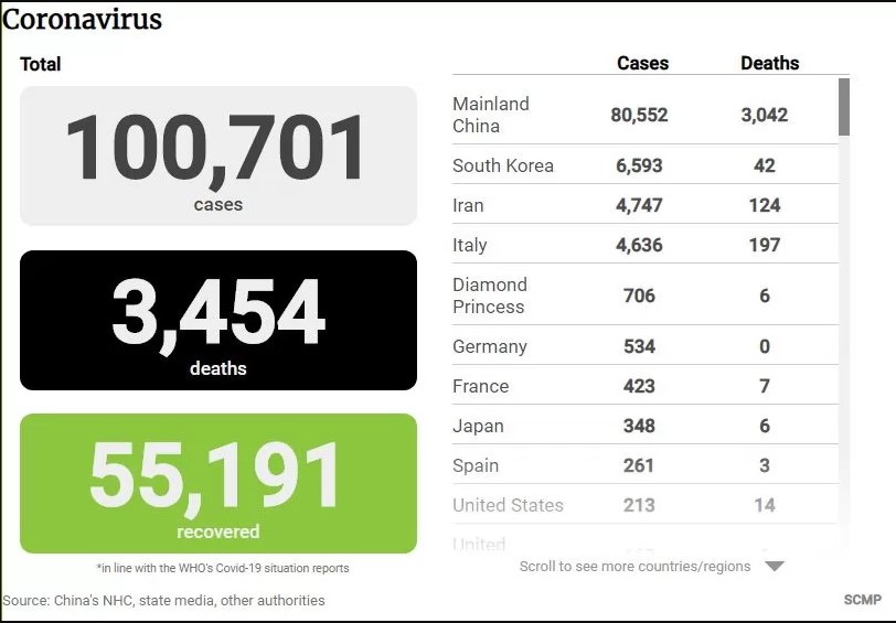 Число случаев заражения коронавирусом в мире увеличилось до 101,9 тыс. человек, погибли более 3400 человек. Об этом сообщает CNN.
