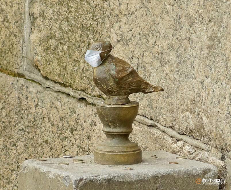Чижик-Пыжик на реке Фонтанке у Михайловского замка в Петербурге обзавелся защитой от коронавируса. Пока горожане пытаются найти маски в аптеках, одну получил герой местного фольклора, сообщает "Фонтанка".