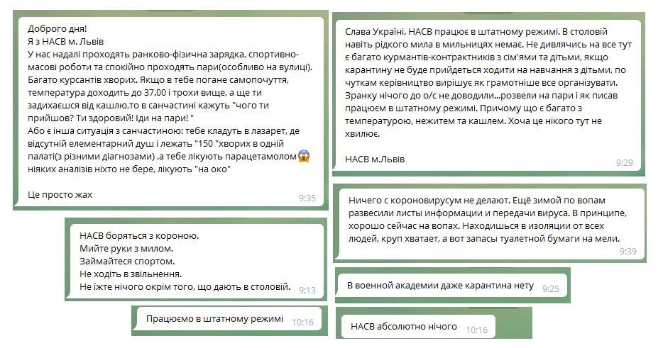Как отмечает паблик, курсанты Национальй академии Сухопутных войск жалуются на то, что указанный военный вуз до сих пор не закрыт на карантин.