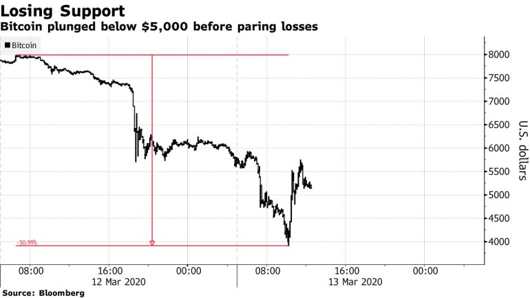 В последние два дня наблюдались большие скачки курса Bitcoin. Снижение стоимости виртуального актива началось в четверг в Нью-Йорке. Затем уже в пятницу на торгах в Азии цена крупнейшей криптовалюты упала на ещё 32% до $3915 долларов, что является самым низким значением с марта 2019 года. В результате, по итогам двух дней падение стоимости составило около 50% (с уровня $8000 до $4000), и это является одним из самых больших снижений за всю историю. Затем к полудню в Гонконге большая часть потерь была возмещена, и к 12:25 цена Bitcoin достигла $5280, а общее снижение за день составило 7,8%.
