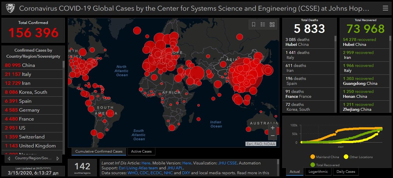 По состоянию на 15 марта, в мире зарегистрировано 156 396 лабораторно подтвержденных случаев заболевания коронавирусом (COVID-19), из них 5833 – летальные, выздоровели 73 968 человека.