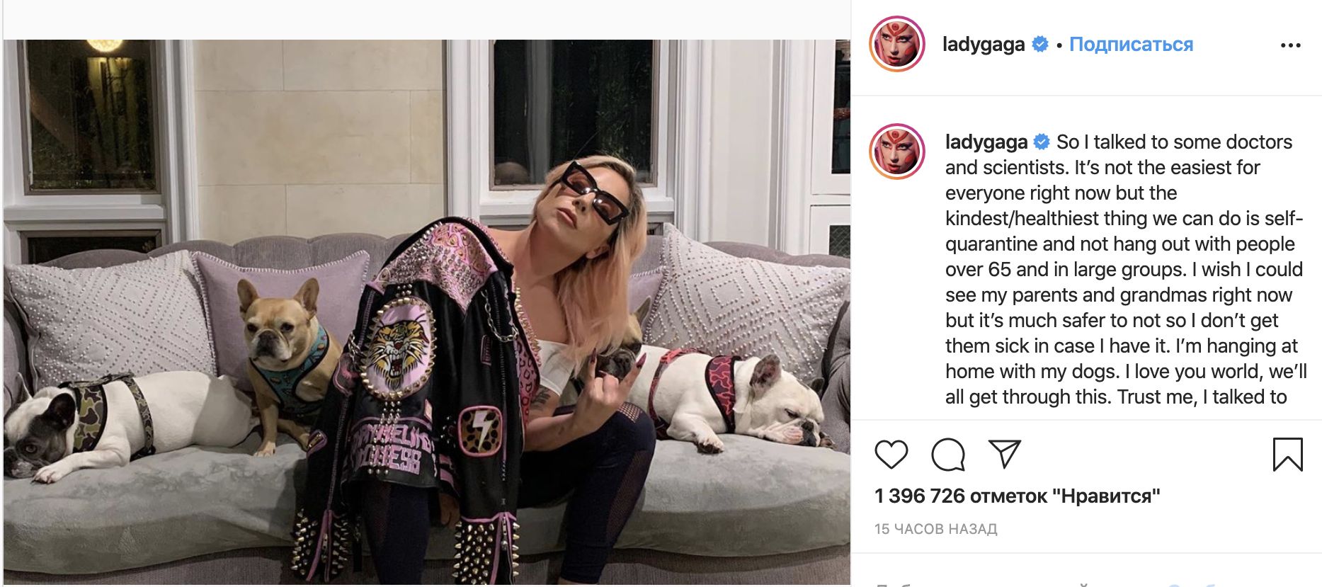 Американская певица Леди Гага решила самоизолироваться из-за коронавируса. Об этом она сообщила на своей странице в Instagram.