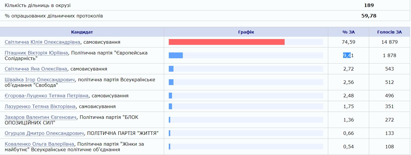 Юлия Светличная по предварительным данным (согласно 59% обработанных протоколов) набирает больше 74% голосов на выборах в Верховную Раду в 179 округе Харьковской области.