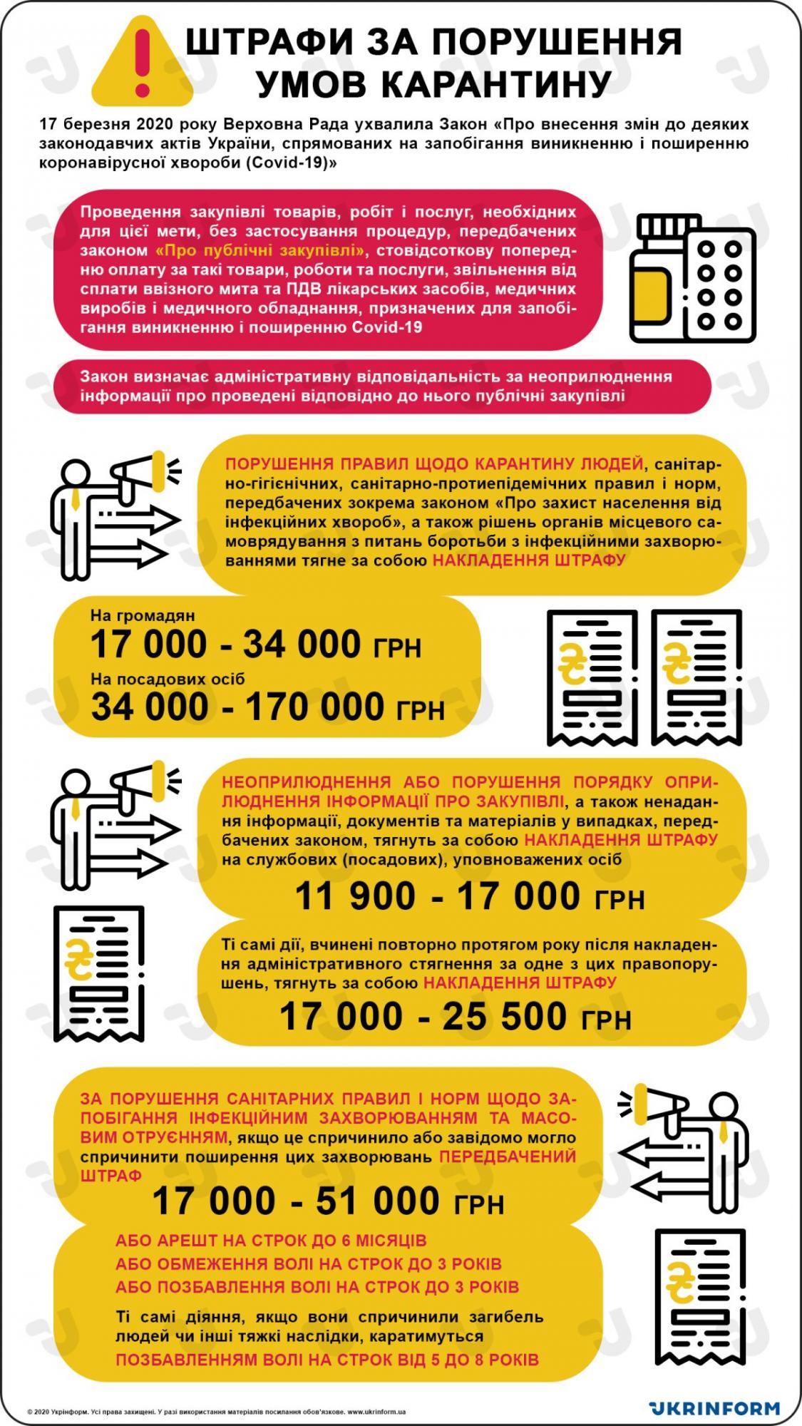 Штрафы за нарушение условий карантина (инфографика) 17 марта 2020 16:35 Верховная Рада ввела административную и уголовную ответственность за нарушение правил карантина.