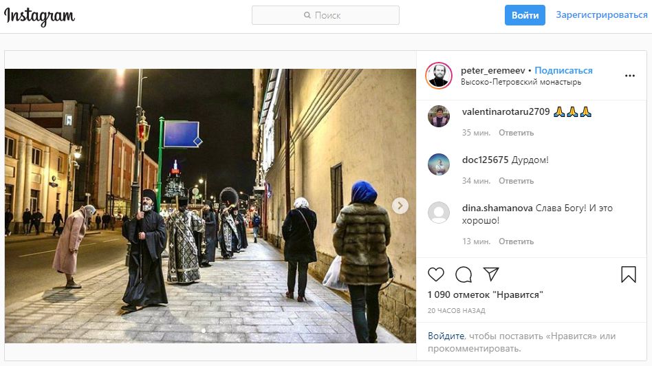 Вечером в среду, 18 марта жители Высоко-Петровского монастыря, находящегося в центре Москвы, провели крестный ход вокруг своей обители с пением об избавлении от коронавируса. Это мероприятие планируется проводить каждый вечер. Об этом на своей странице в Instagram сообщил наместник обители игумен Петр (Еремеев).