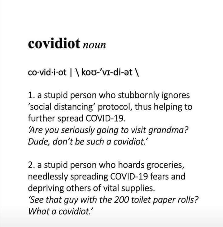 В онлайн-словаре слов и фраз англоязычного сленга Urban Dictionary в разгар пандемии коронавируса появилось новое слово — Covidiot. Оно обозначает человека, который либо не следует советам социально дистанцироваться во время пандемии и не соблюдает карантин (тем самым способствуя распространению COVID-19), либо скупает в магазинах продукты питания и средства дезинфекции и индивидуальной защиты сверх меры (провоцируя панику и лишая других людей возможности купить необходимые вещи и продукты).