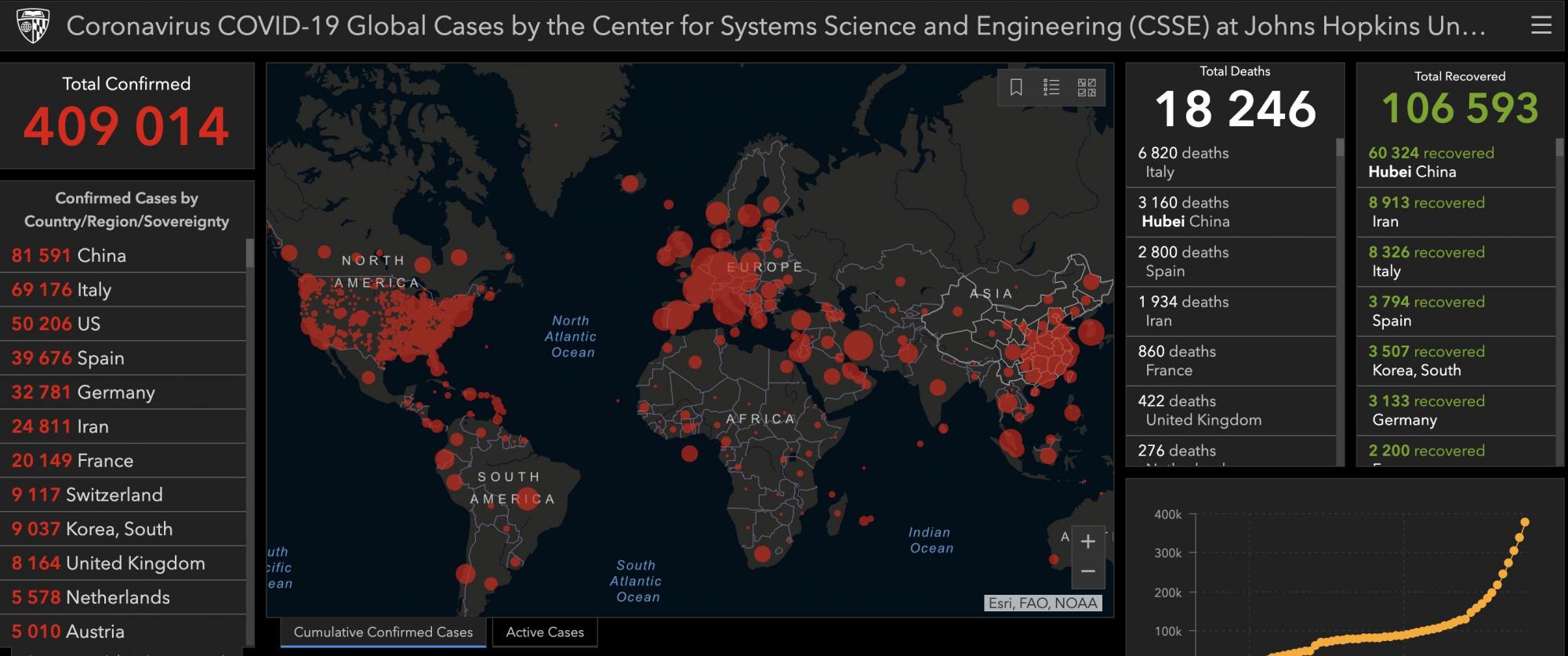На настоящий момент в мире насчитывается более 400 тысяч человек, заразившихся коронавирусом COVID-19. Такие данные приводит американский университет Джонса Хопкинса.