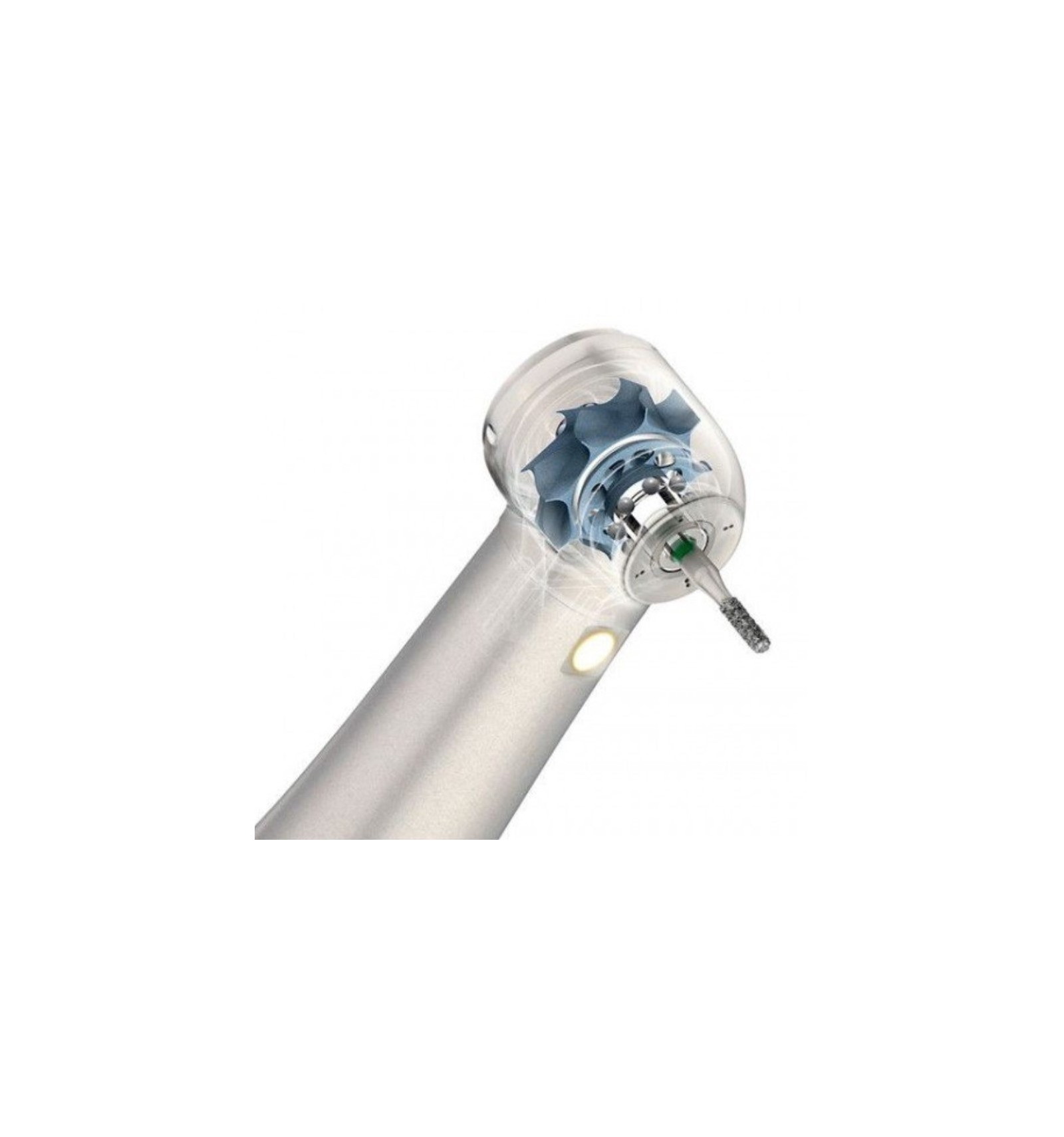 Вращение в турбинном наконечнике обеспечивает энергия сжатого воздуха. Такая система позволяет при минимальной мощности достичь максимальной скорости вращения (от 150 до 500 тыс.об./мин.) Именно турбинные наконечники используют для препарирования эмали, иссечения материалов реставрации.