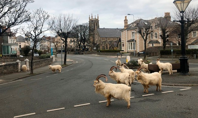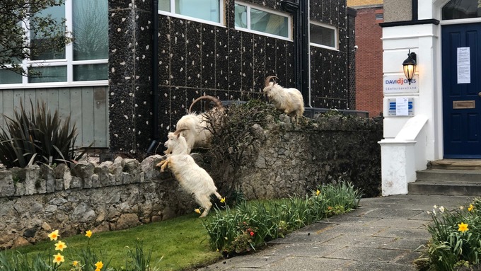 Обычно кашмирские козы обитают на мысе Великий Орм. Скорее всего, сейчас они спустились, чтобы найти свежую траву. Отсутствие людей на улицах позволило им остаться подольше.