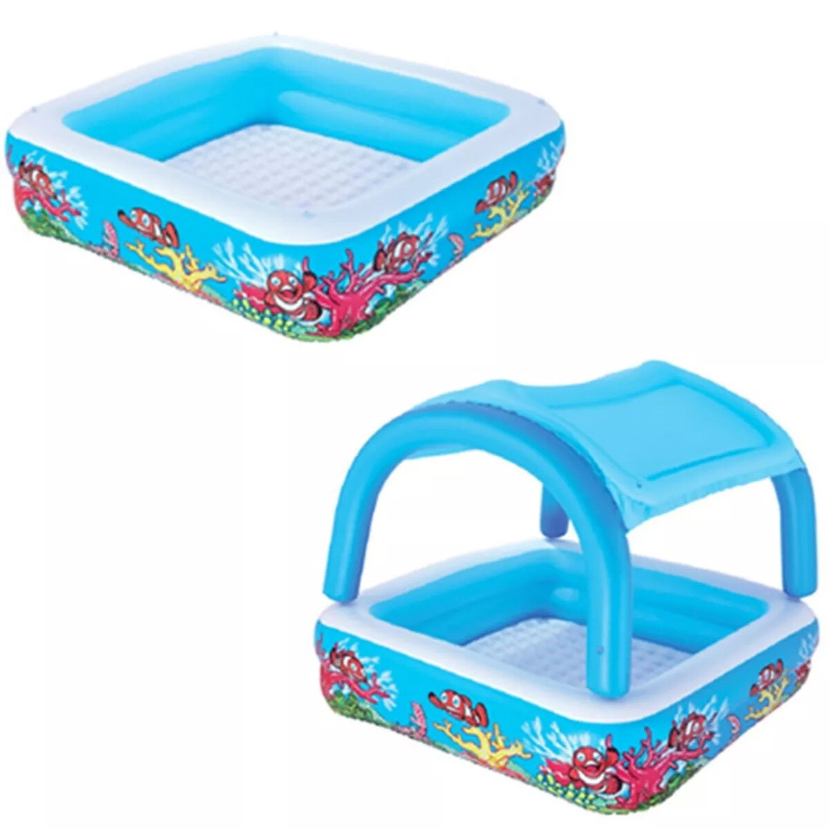 Наличие солнцезащитного тента убережет чадо от ожогов в летний зной. Пригодится и лестница, если глубина чаши превышает 100 см.