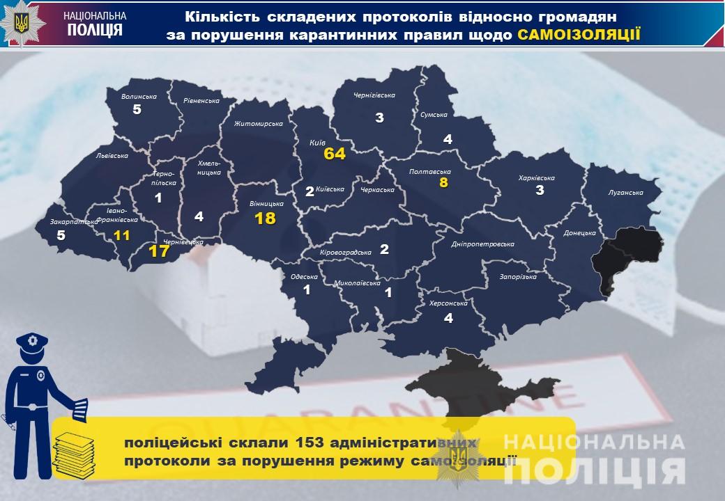 За нарушение правил карантина на территории Украины составлены 3566 административных протоколов, из них 153 за нарушение режима самоизоляции. По результатам рассмотрения судами наложены штрафы на общую сумму более 272 тыс гривен.