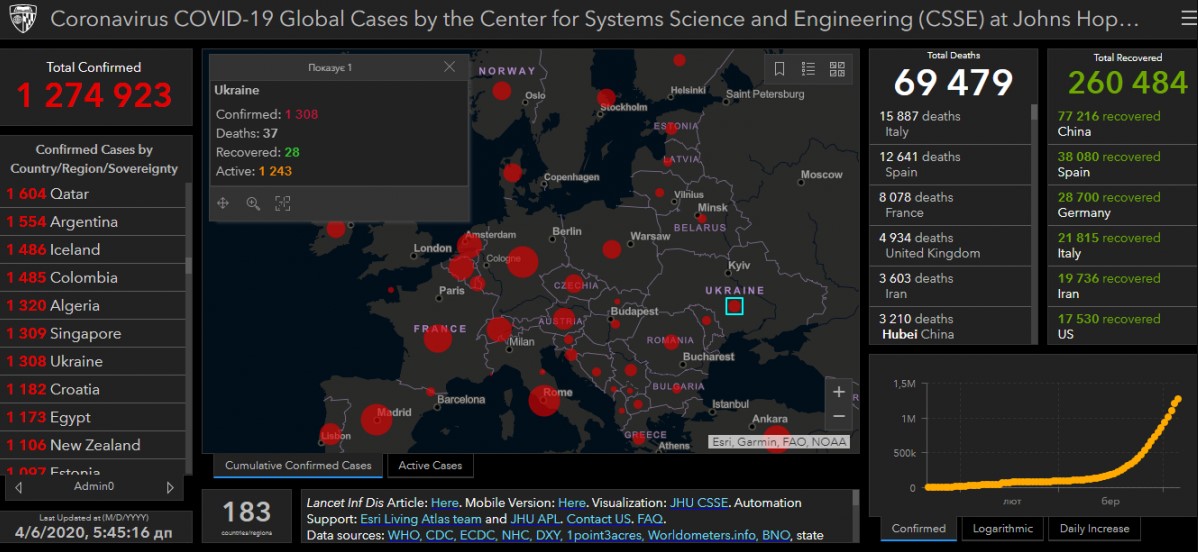 Об этом пишет Украинская правда со ссылкой на данные центра Джона Хопкинса, который регулярно обновляет статистику зарегистрированных случаев по странам и миру.
