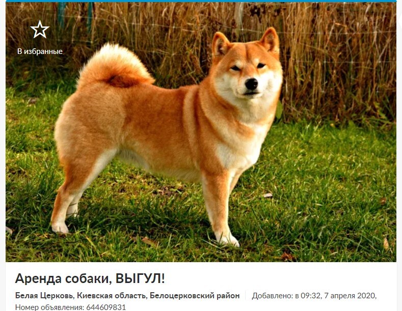 В г. Белая Церковь на OLX предлагают для прогулок в парке, на набережной центральном пляже собаку породы шиба ину. Владелец отметил, что она "воспитанная и не конфликтная" и указал стоимость прогулки: час – 250 грн, два часа – 450, а три часа - 650.
