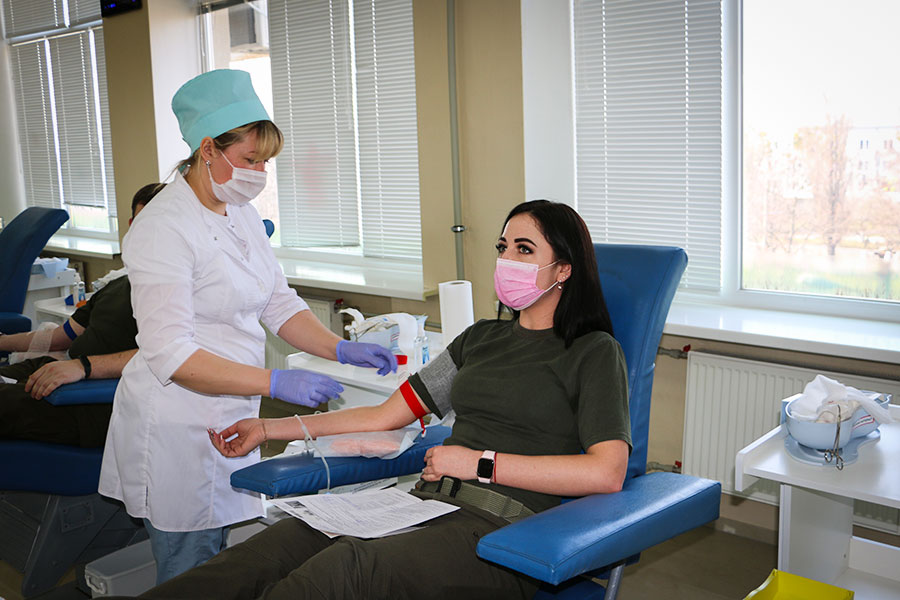 «Карантин сильно вплинув на нашу роботу. Число донорів впало у чотири рази. А ми маємо щонайменше видати до 2000 доз еритровмісних компонентів лікарням щомісяця. При чому, щоб отримати одну таку дозу вагою 250 грам, ми маємо взяти кров у одного донора. Це, звісно, в ідеалі, адже частина доз вибраковується. Тим часом до карантину ми брали кров з п’ятнадцяти наших відділень трансфузіології у Харкові та області. Тепер нам кров передає лише відділення у Чугуєві та декілька лікарень. Ми, навіть, пустили мікроавтобус від Держпрому, щоб возити донорів до нас, але їх все одно бракує. Ситуація поліпшилася тільки тоді, коли нам на допомогу прийшли військові», – пояснила завідувачка відділу заготівлі крові та її компонентів Харківського обласного центру служби крові Аліна Потапенко.