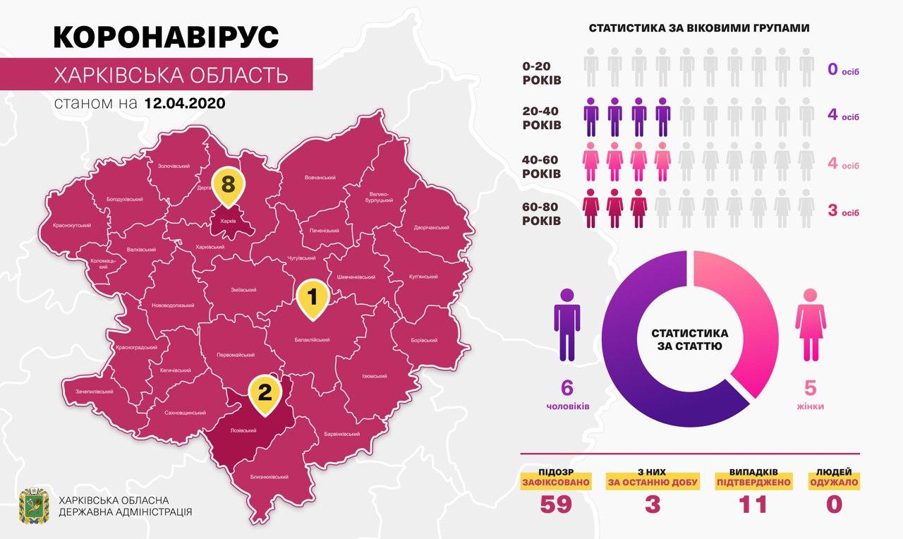 По состоянию на 12 апреля в Харькове и области 11 подтвержденных случаев заболевания COVID-19 (+3 за сутки).