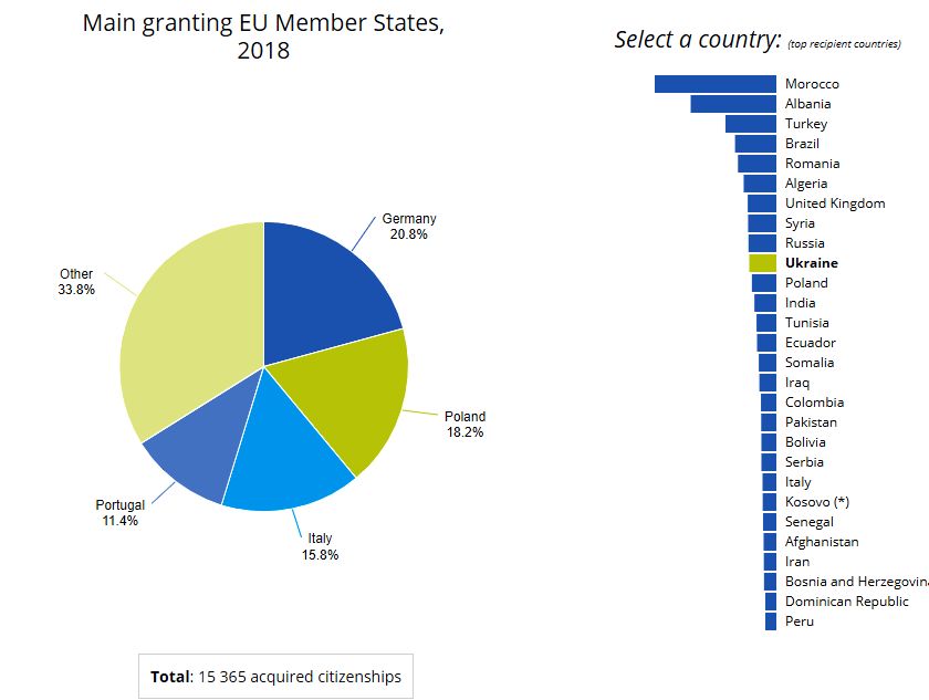 - 2018 – 15365 граждан Украины получили гражданство стран ЕС