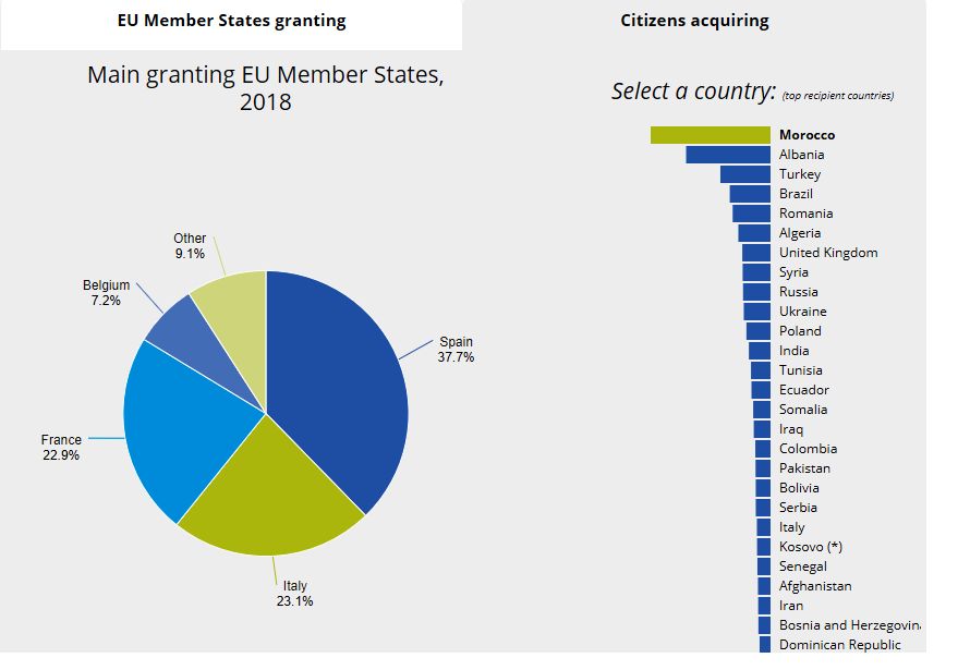 Среди стран ЕС больше всего своих гражданств для жителей всех стран мира оформляет Испания (116,7 тысячи в 2018 году), на втором месте Италия (112,5 тысячи), замыкает тройку Франция (110 тысяч).